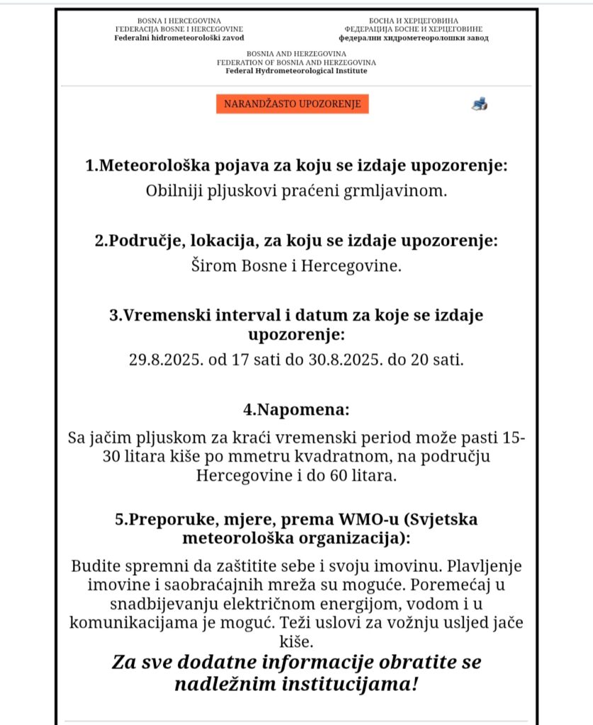 Federalni hidrometeorološki zavod Bosne i Hercegovine izdao je narančasto upozorenje zbog obilnih pljuskova praćenih grmljavinom. Upozorenje je proglašeno za područje Bosne i Hercegovine za danas od 17.00 sati do sutra do 20.00 sati.