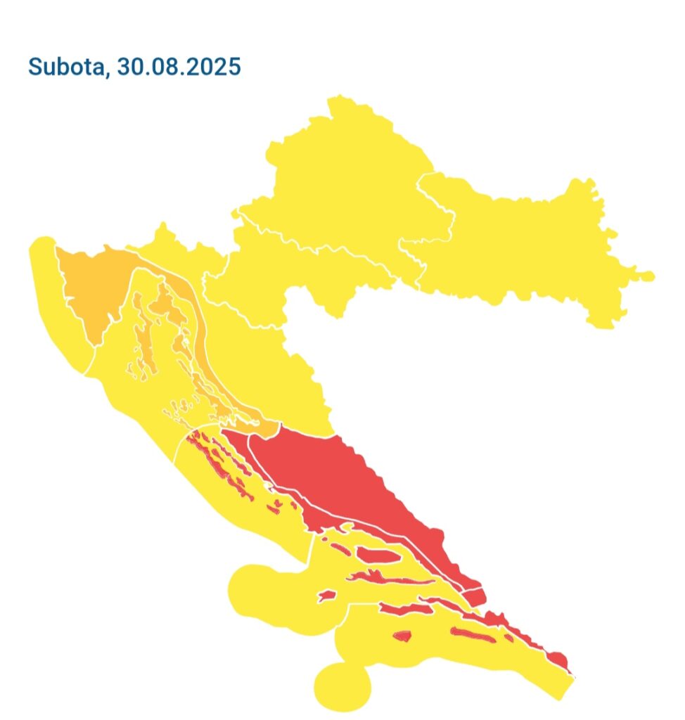 Državni hidrometeorološki zavod Republike Hrvatske izdao je najveći stupanj upozorenja za subotu 30.kolovoza za područje od Splita do Dubrovnika.