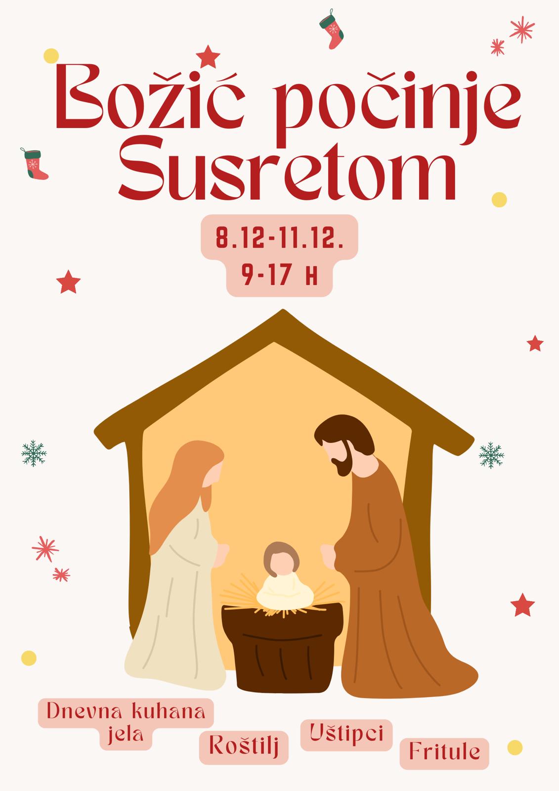 Udruga Susret organizira tradicionalni Božićni sajam koji će se održati od 8. do 11. prosinca 2025. godine, svakog dana u vremenu od 9:00 do 17:00 sati na adresi Potpolje 123.